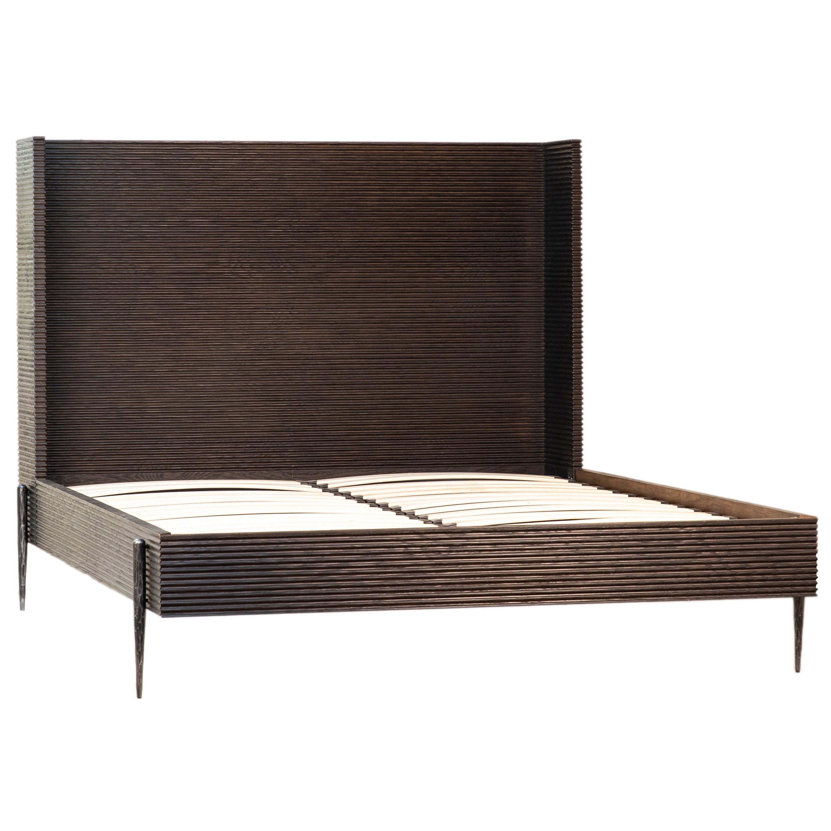 Create a modern- chic vibe in your bedroom with this stylish bed. Built with a low platform set on tapered metal legs, it features all the elements of stylish mid-century modern design. The wrap-around headboard features a crisp linear wood cut design with a classic brown finish that adds warmth to any space. Available in Queen and Eastern King.