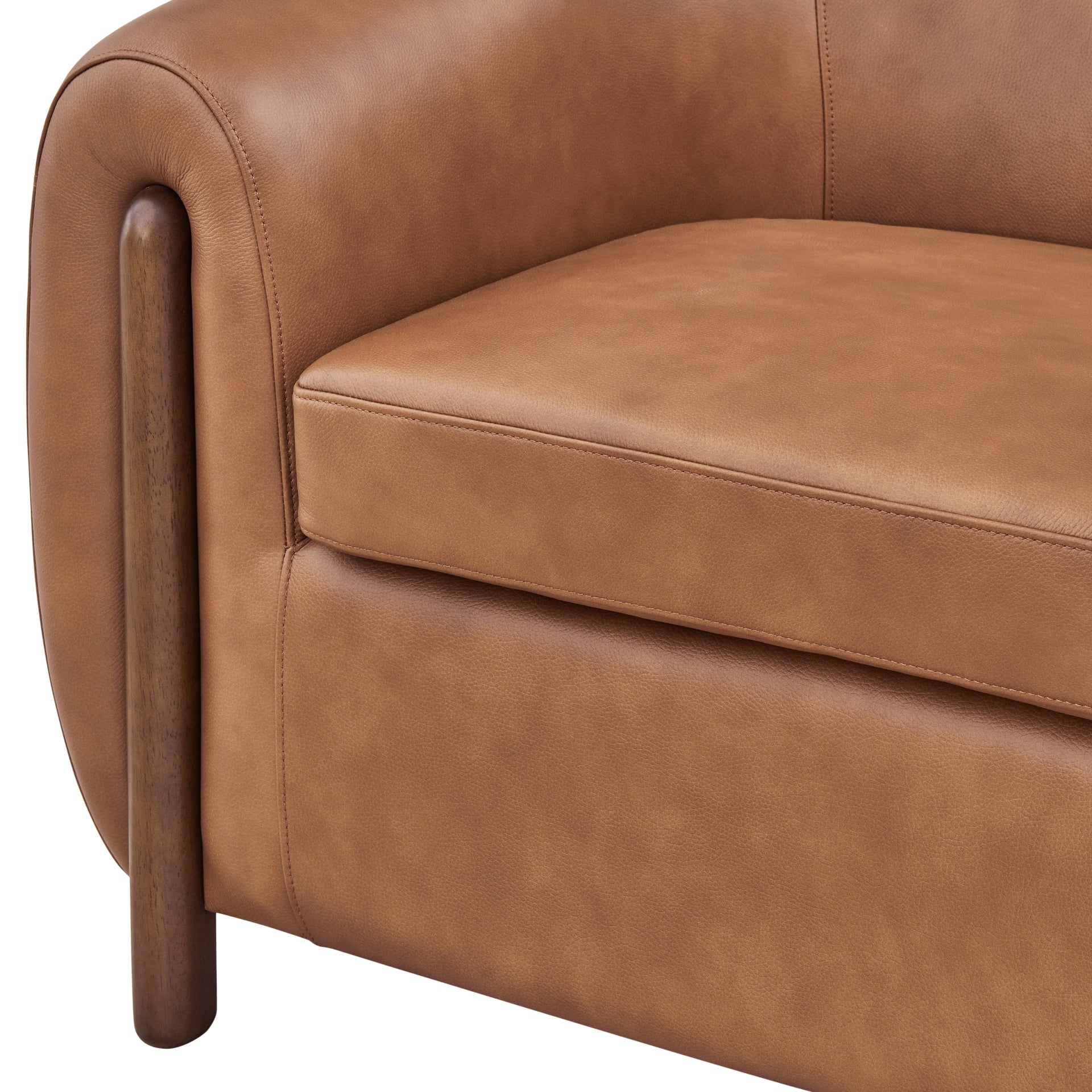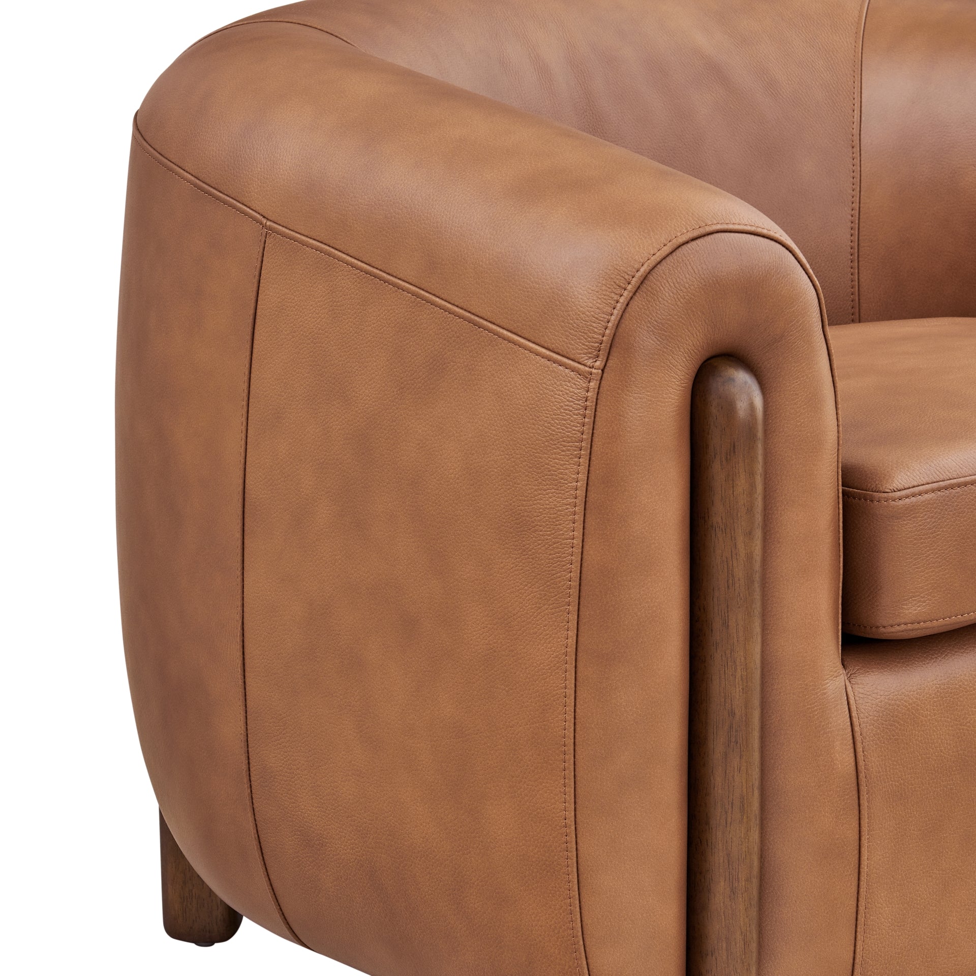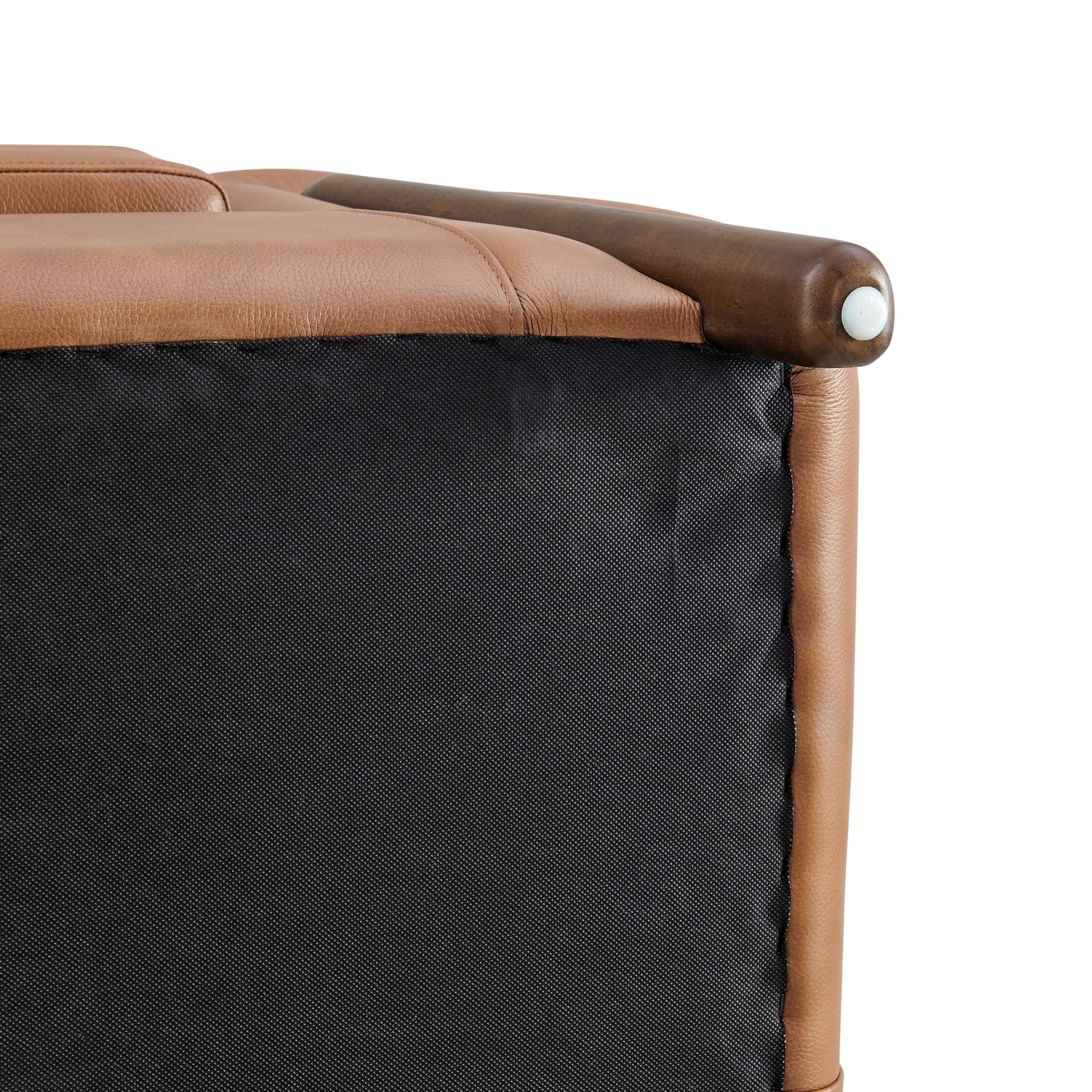 Top-grain leather in Garrett Caramel is tailored over a sturdy engineered-wood frame reinforced with solid larch wood and solid rubberwood for long-term stability. Sculpted solid-wood legs (the same dowels that accent the arms) provide a durable base, while plastic glide footings protect floors and make repositioning a breeze. Ships fully assembled—unbox, place, and sit like you mean it.