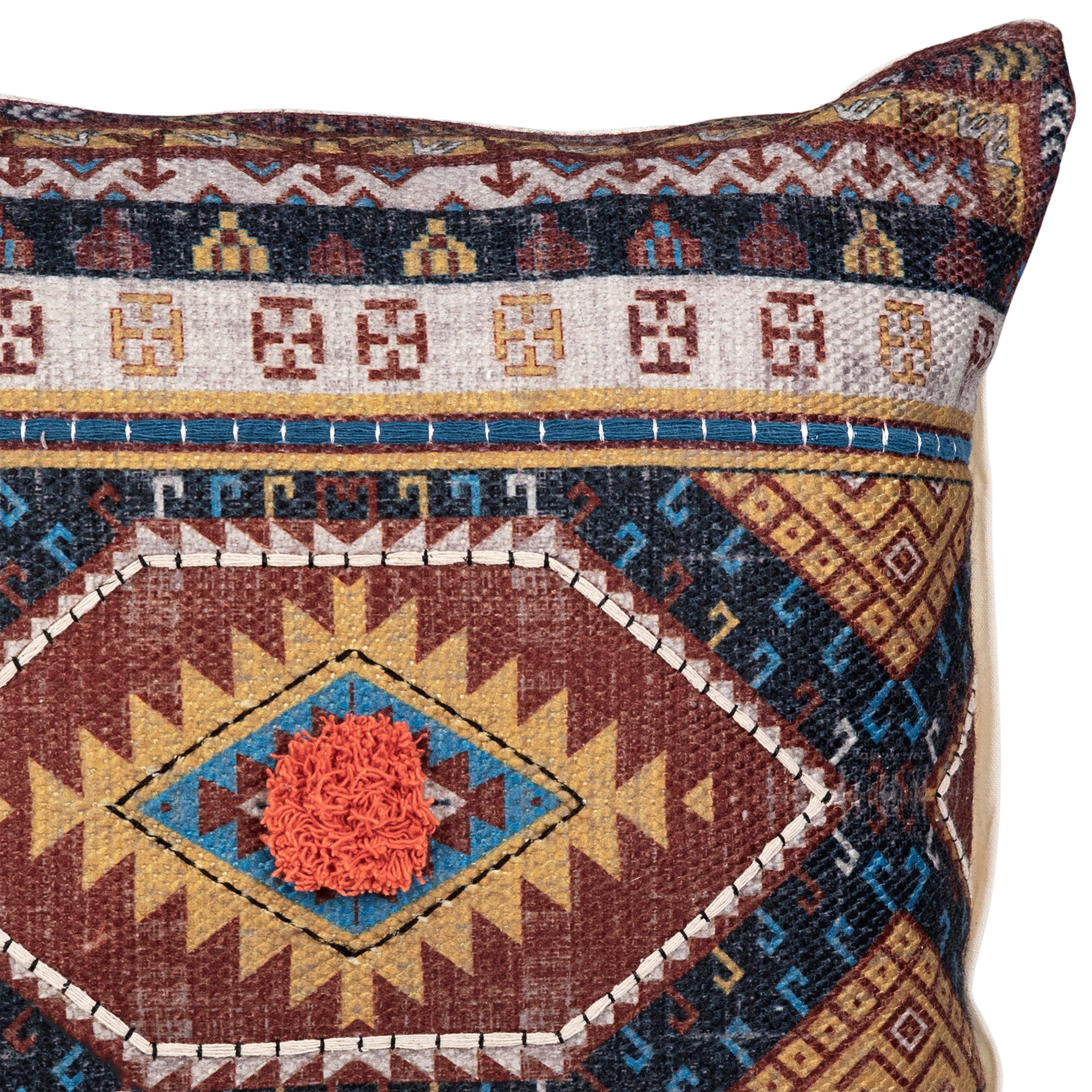 Adorn your home with this lively multicolored 20x20” pillow. Its intricate patterns and charming red center pom-pom lend extraordinary artistry to any seat. This pillow was handwoven in India with high-quality cotton and poly filling for a soft and cozy touch.