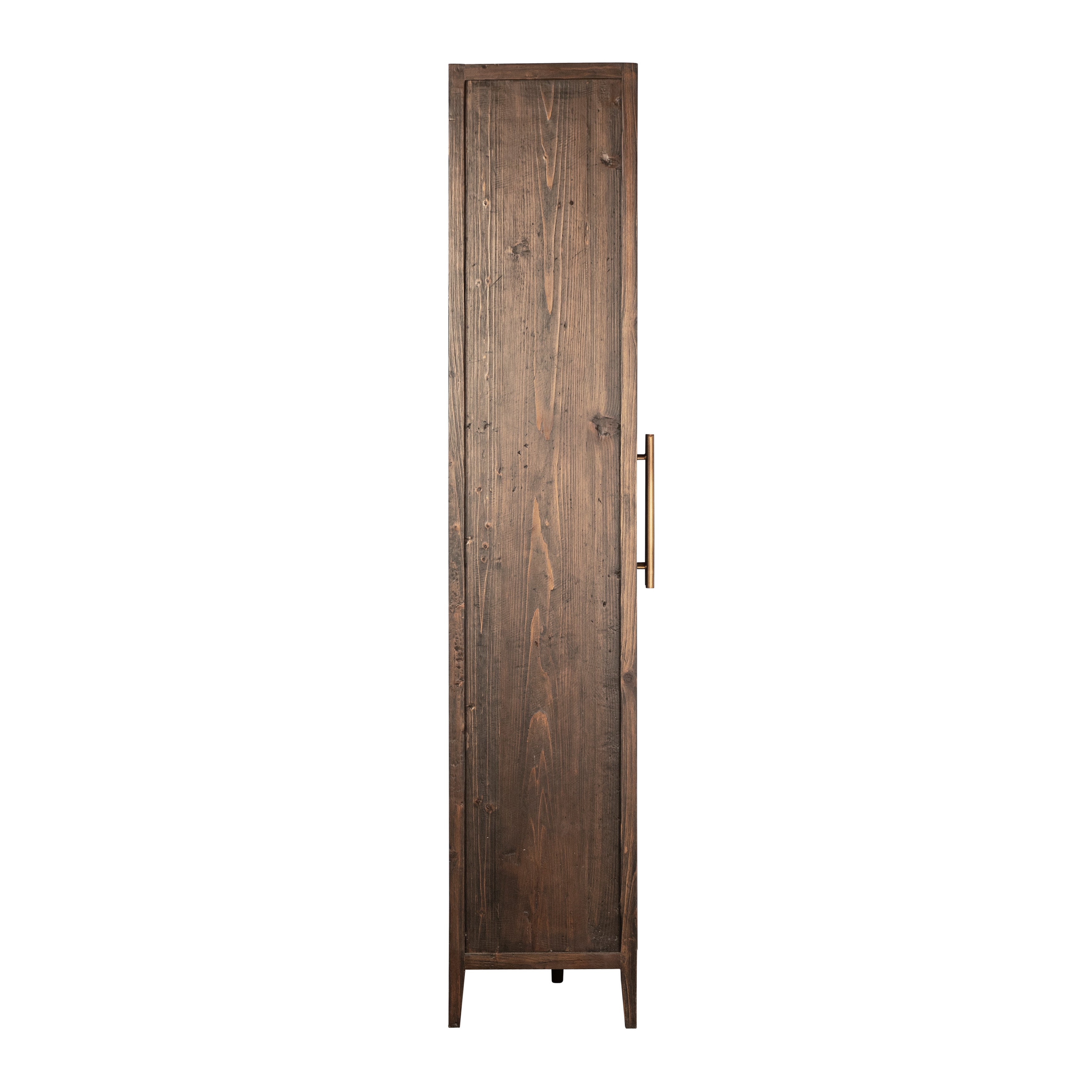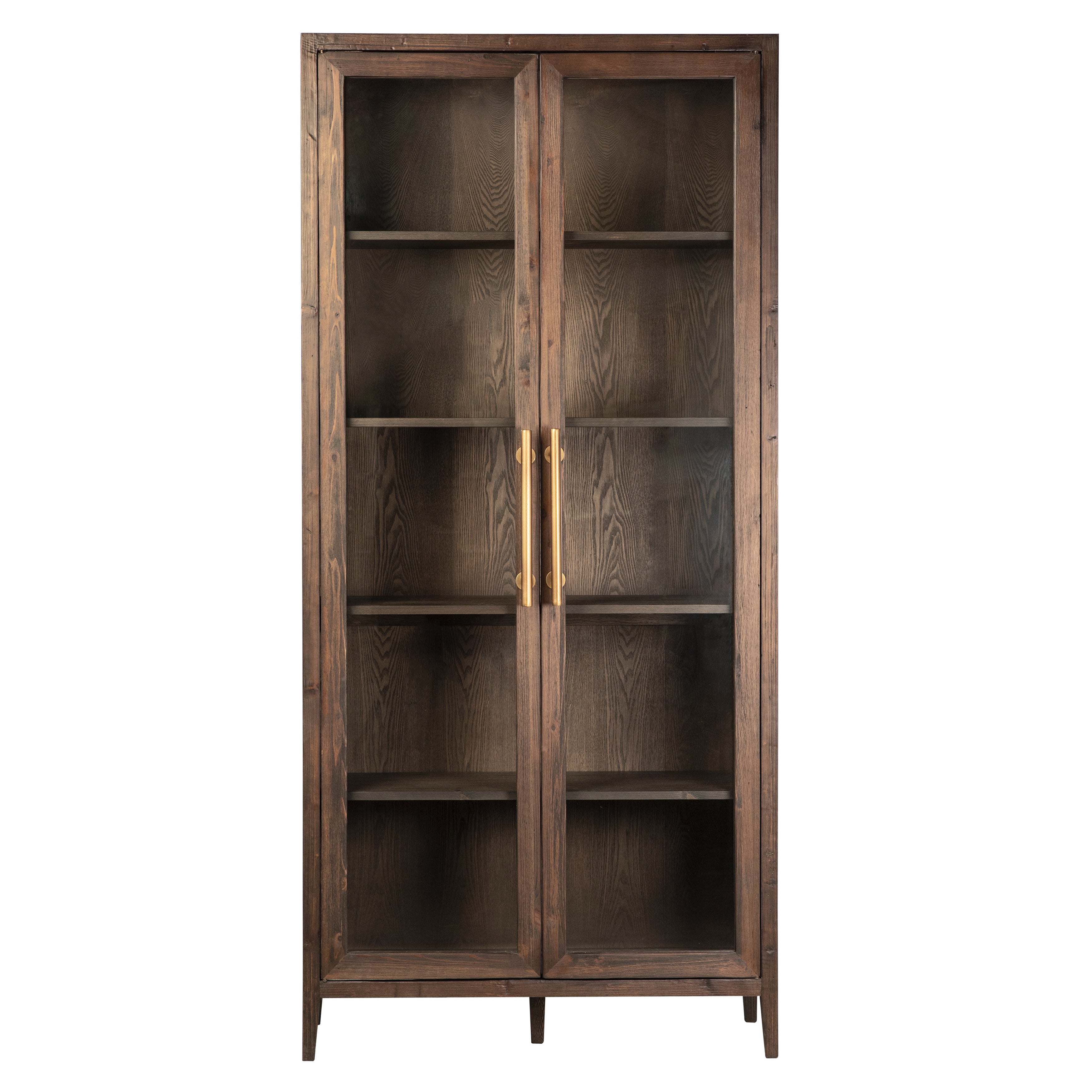 This 93” tall cabinet features a classic design, solid reclaimed pine wood construction, and a dark brown wash finish to create a timeless look. Two large wood-framed glass doors open to five shelve compartments that can perfectly showcase collections of books, framed photographs, décor, or kitchenware. The simple design of complements any style or space while keeping the focus on your admired display.