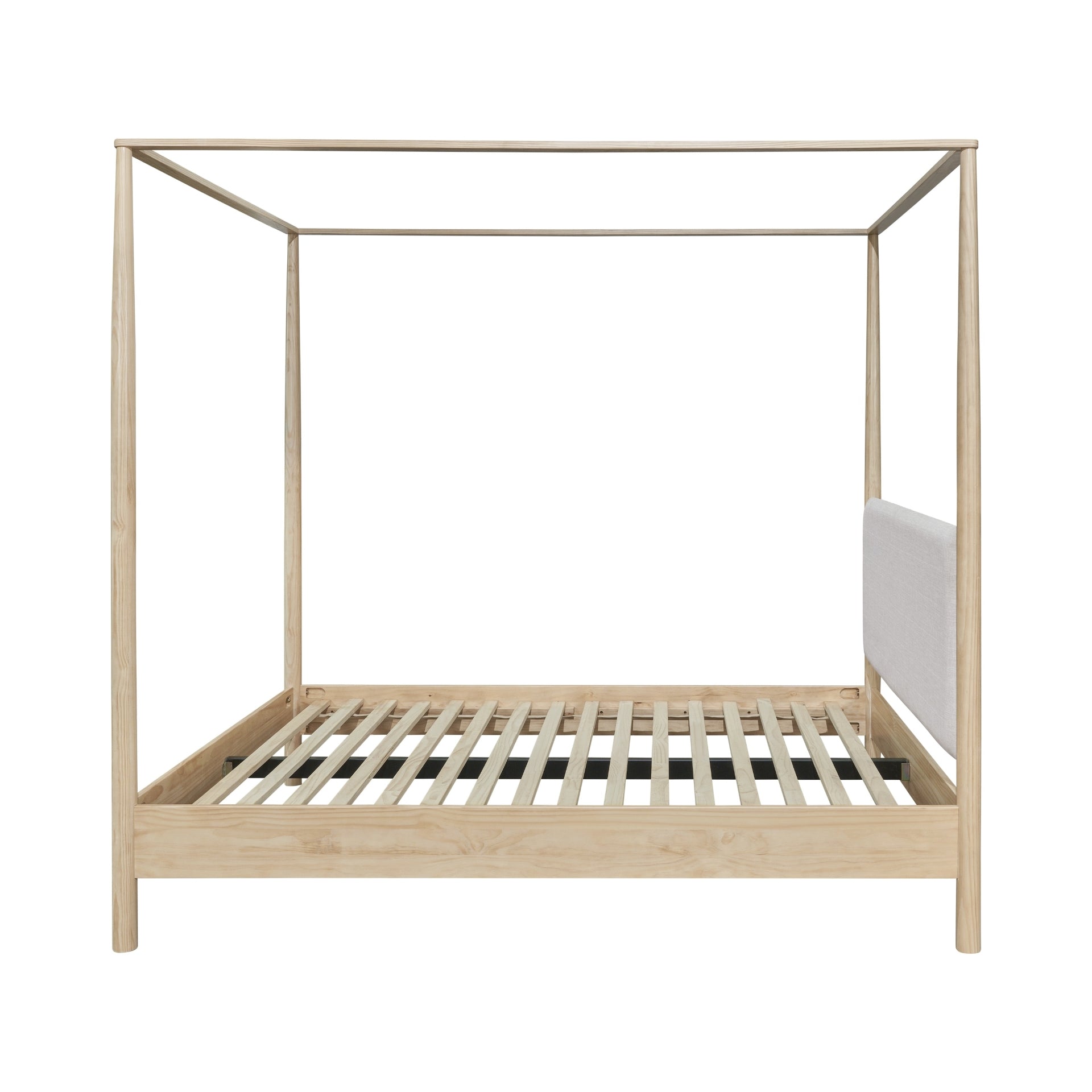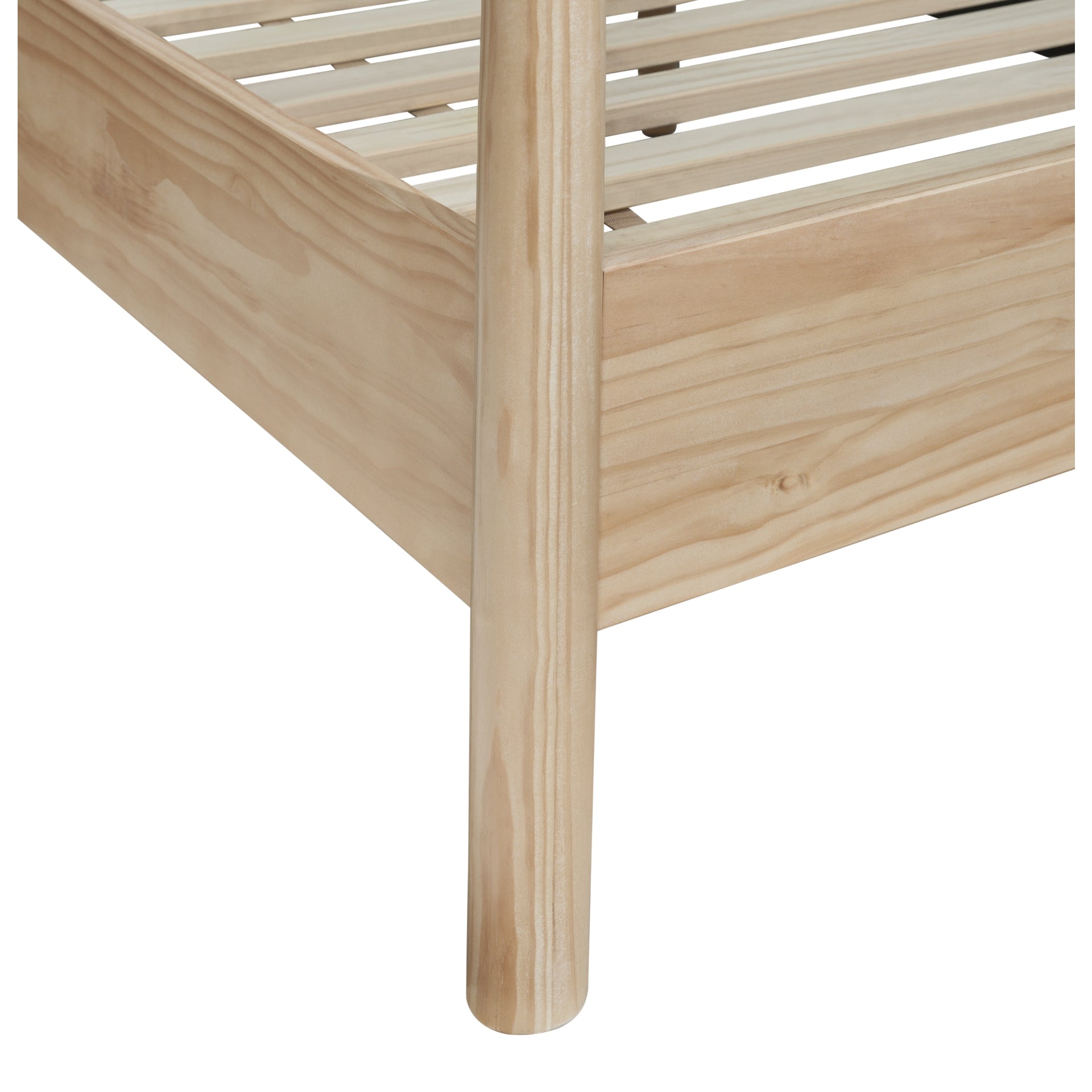 For a touch of Modern Japandi with 80's flair, this canopy bed offers both chic and sturdy style. Sixteen solid wood slats provide excellent mattress stability. The main frame and the legs are also sturdy, solid pine wood.
