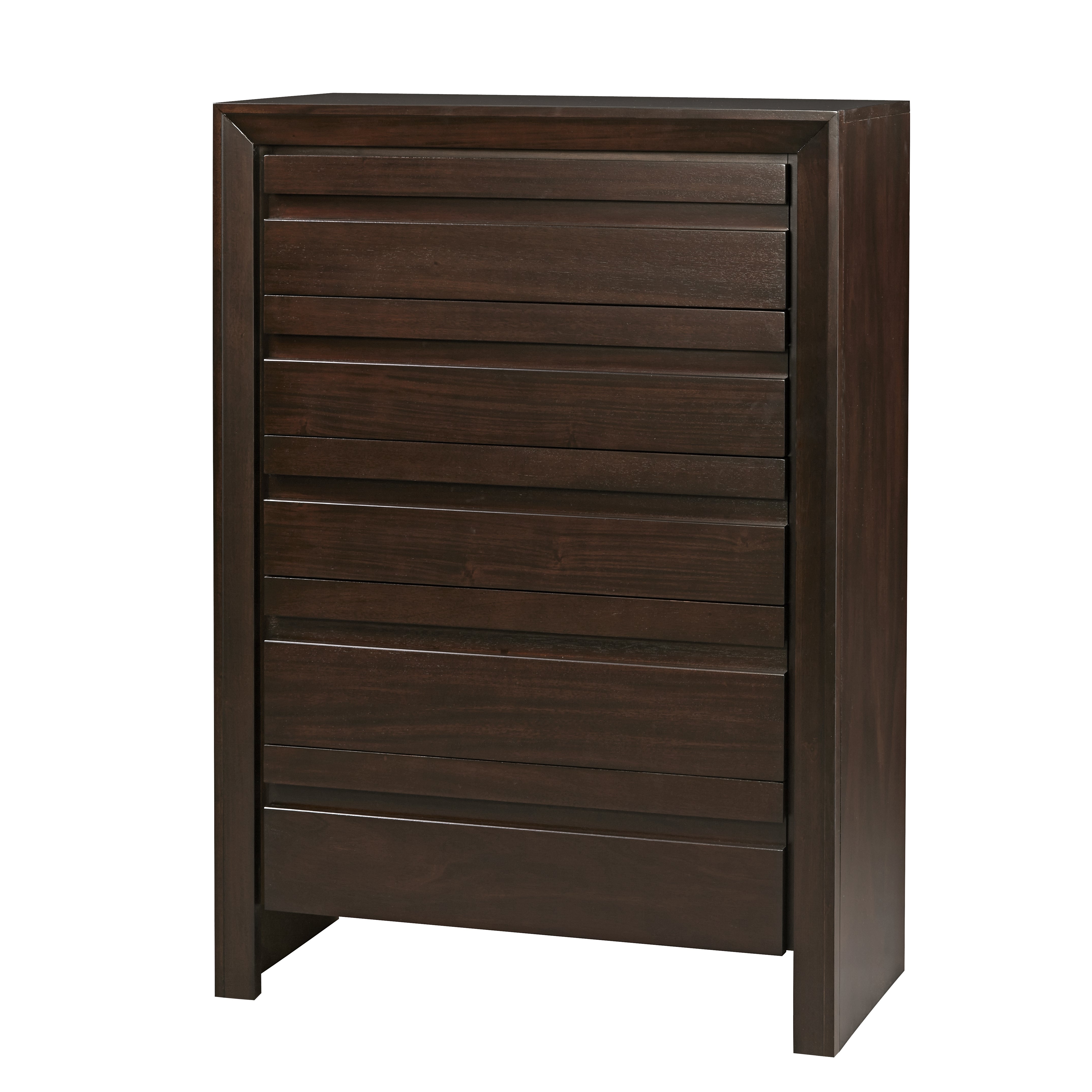 Wake up with structure with this architecturally designed contemporary collection. Thick mitre-jointed outer posts are the focus as the furniture effortlessly evolves following clean lines from the top panels all the way to the floor. Tropical Mahogany solid wood and Mahogany wood veneers are finished in a dark chocolate brown featuring tones ranging from dark brown to golden brown and burgundy. A high picture-framed headboard panel showcases geometric square insets with wood bed rails and footboard. The low profile footboard pushes outward with a mitre-jointed frame that carries the design of the matching dresser to the bed feet. The highest quality metal to metal hardware is used in the bed construction, and a platform bed slat system renders box springs optional. Carved drawer pulls run the length of each drawer to ensure easy operation without the visual distraction of hardware. Each drawer features full extension drawer glides on sanded and stained solid wood drawer boxes with front/rear English dovetail joinery. The nightstands feature deep drawers and a 3-outlet power strip in the top drawer. The dresser includes a felt-lined top drawer. The large beveled glass mirror is framed in a rich finish of chocolate brown, a medium dark hue with highlights and reaches high to finish this set. The Element Collection is is ready to define your bedroom, offering ample storage and a contemporary package.