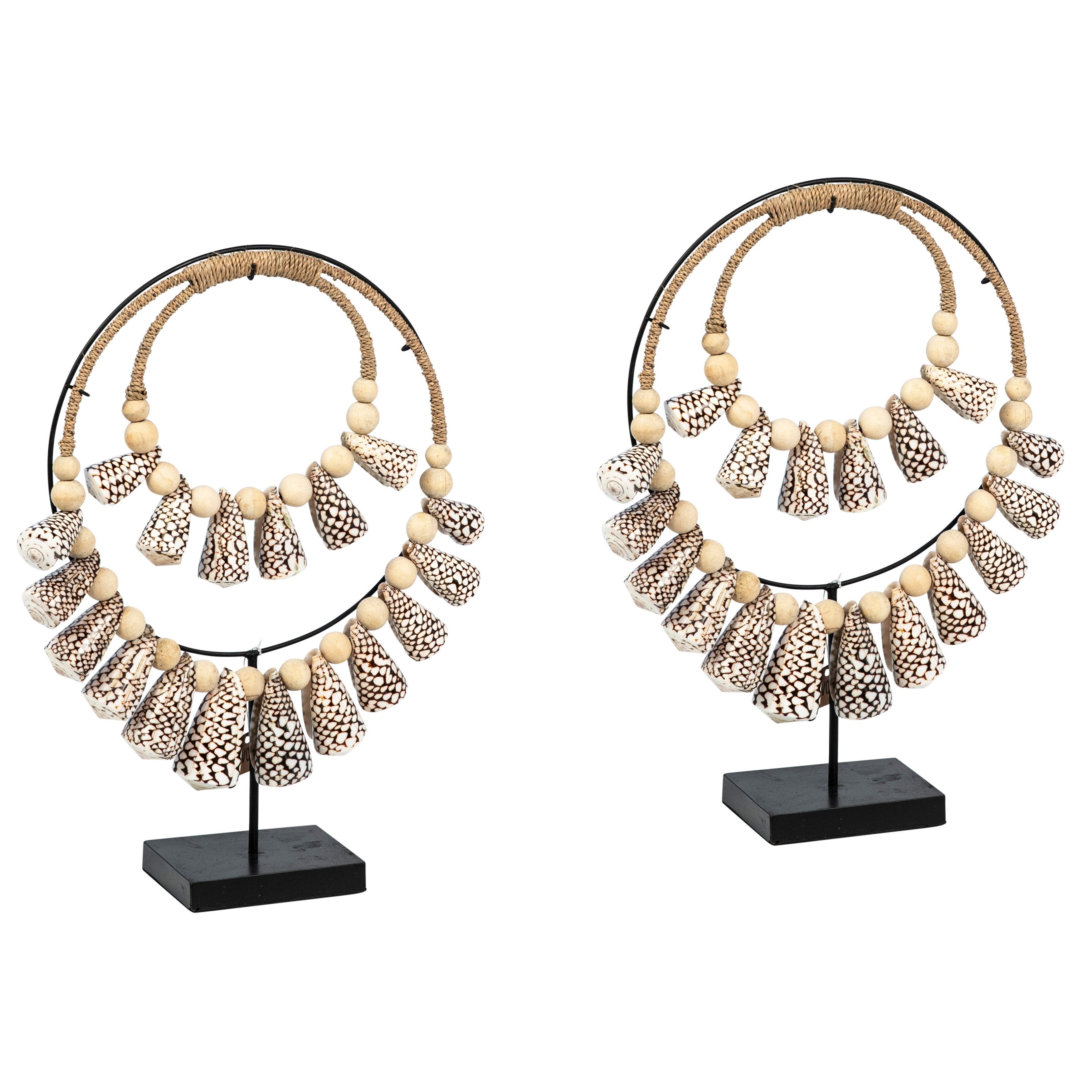 Elevate your space with this decorative necklace set meticulously handcrafted by Indonesian artisans. This beautiful statement piece features two rings of natural seashells and wooden beads sewn together on a black metal base. Each piece will have unique variations in color and size due to the artistry that goes into crafting, lending a traditional touch to your home decor.