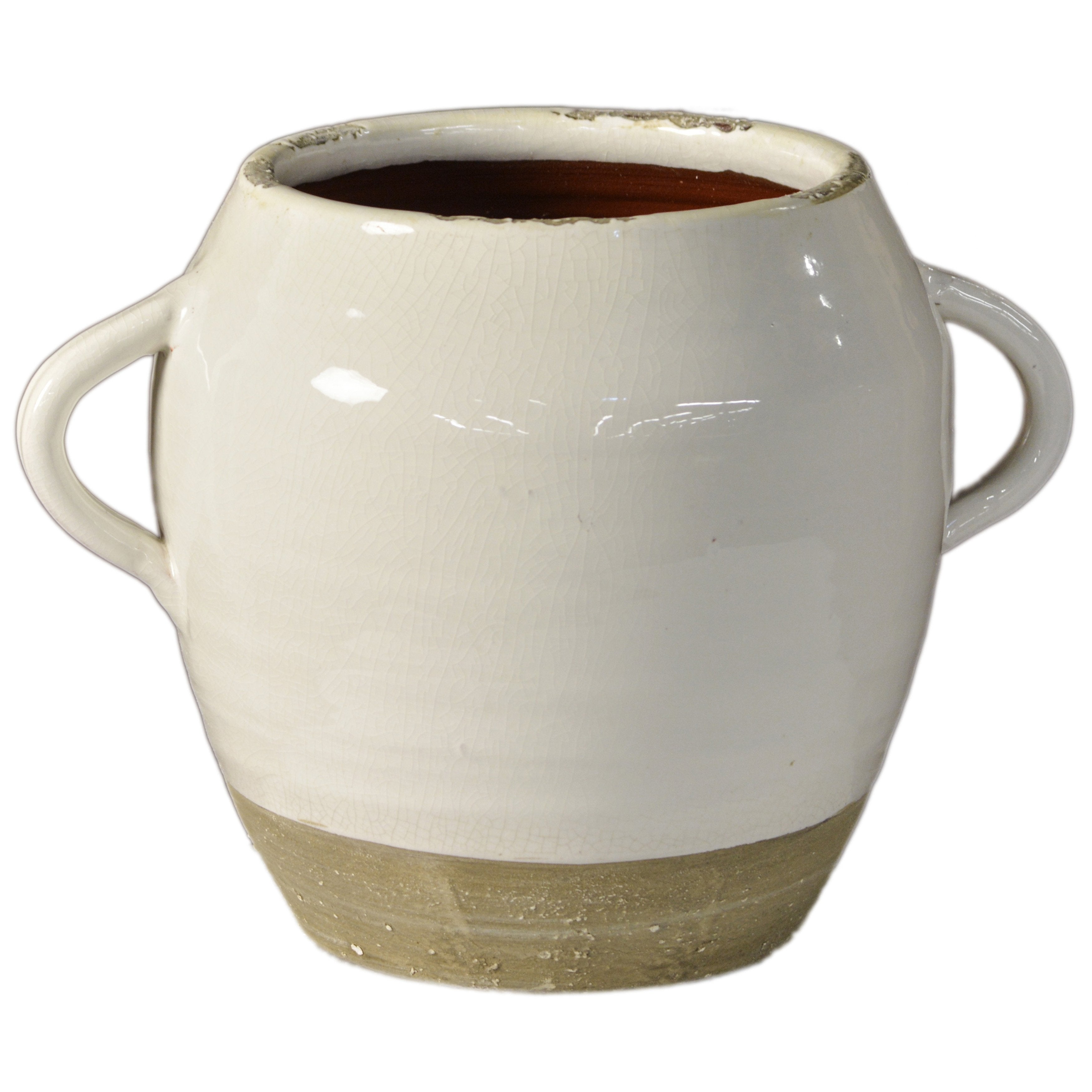 Add a charming touch to your home décor with this decorative terracotta vase. Showcasing an off-white tone and a natural finish at the bottom of the vase, completed with two top handles for added charm. The neutral color palette of this vase brings a polished style to both indoor and outdoor spaces. Due to the handcrafted nature of terracotta, each piece will have slight variations in shape and color. The tiny imperfections will make every piece unique and one-of-a-kind.