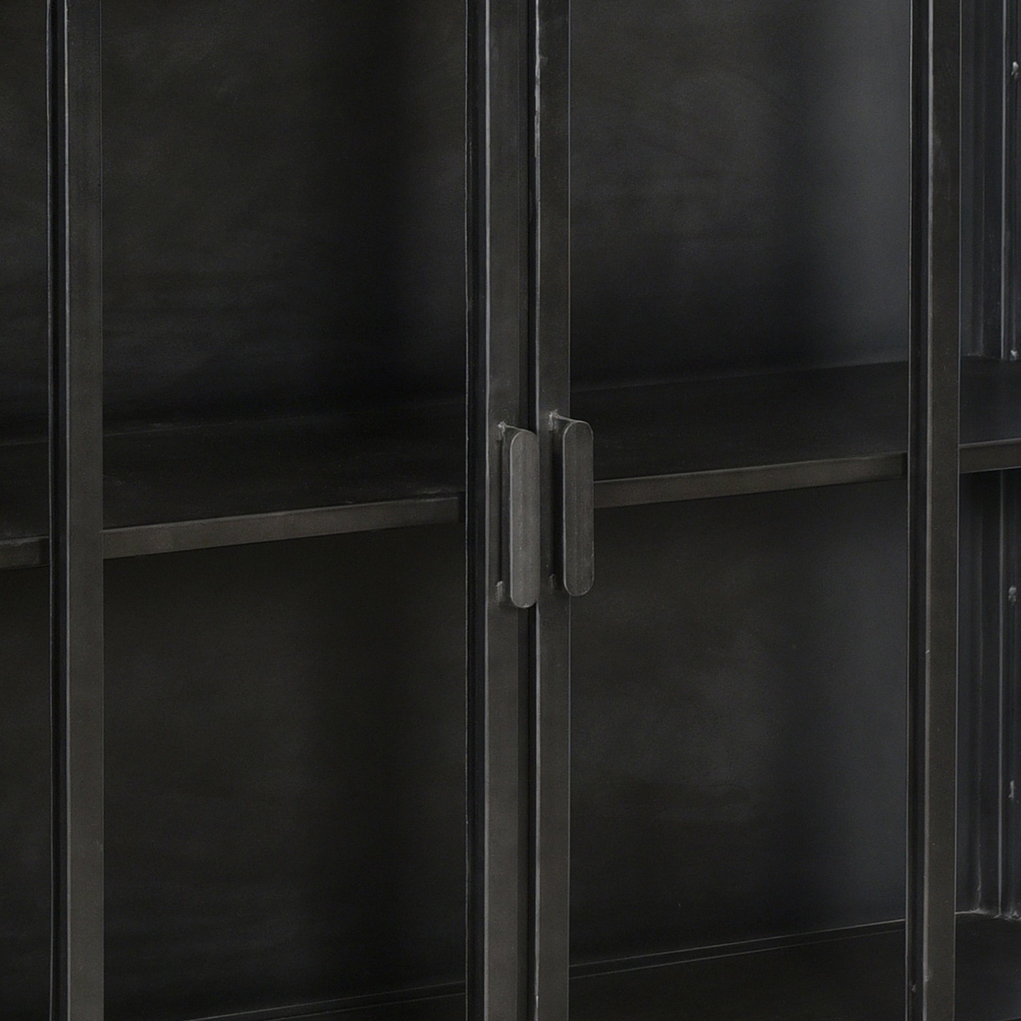 Keep your bedroom, kitchen, or living room organized with our stylish Roman Cabinet. Four glass doors with a bar pull open designed to keep dust away from your keepsakes. Featuring an industrial minimalist design and finished with antique gunmetal framing and shelves.