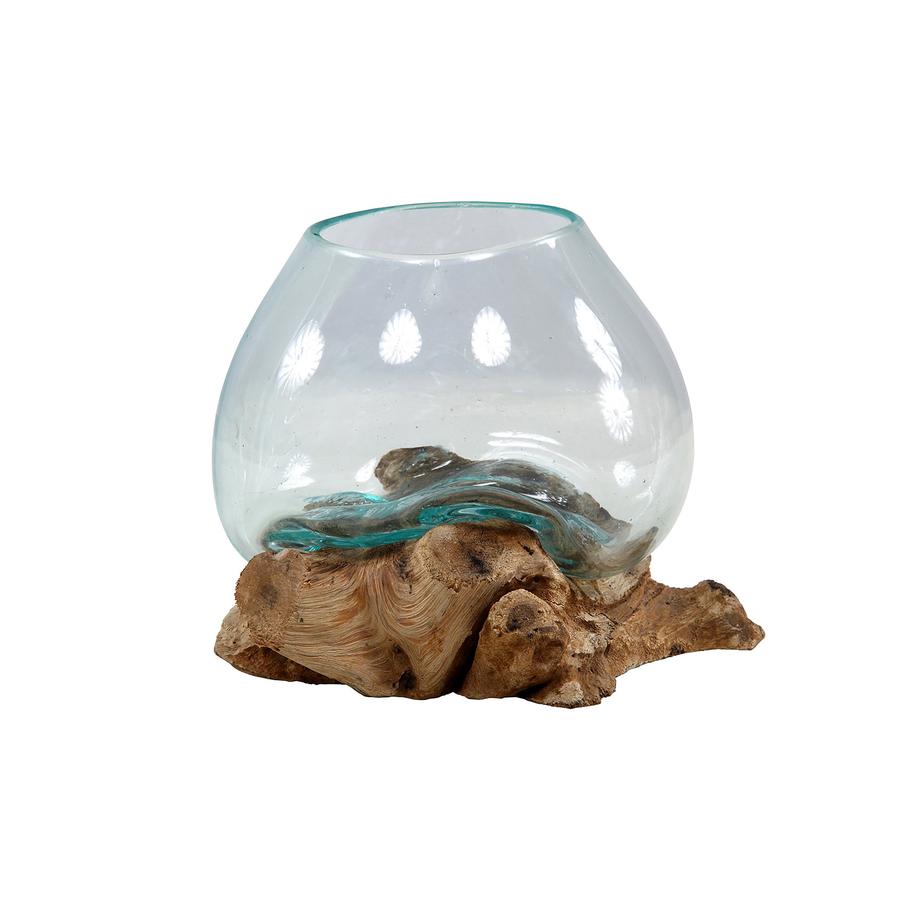 Display a sculptural centerpiece in your home and enhance any setting with organic artistry. Showcasing a transparent aqua glass bowl formed over a natural teak wood base that features a live edge effect, this 6x6" glass bowl can be filled with fresh succulents, a terrarium, or botanical flowers to transmit beauty and tranquility. Each piece is uniquely hand-crafted by skilled artisans, and no two pieces are exactly alike.