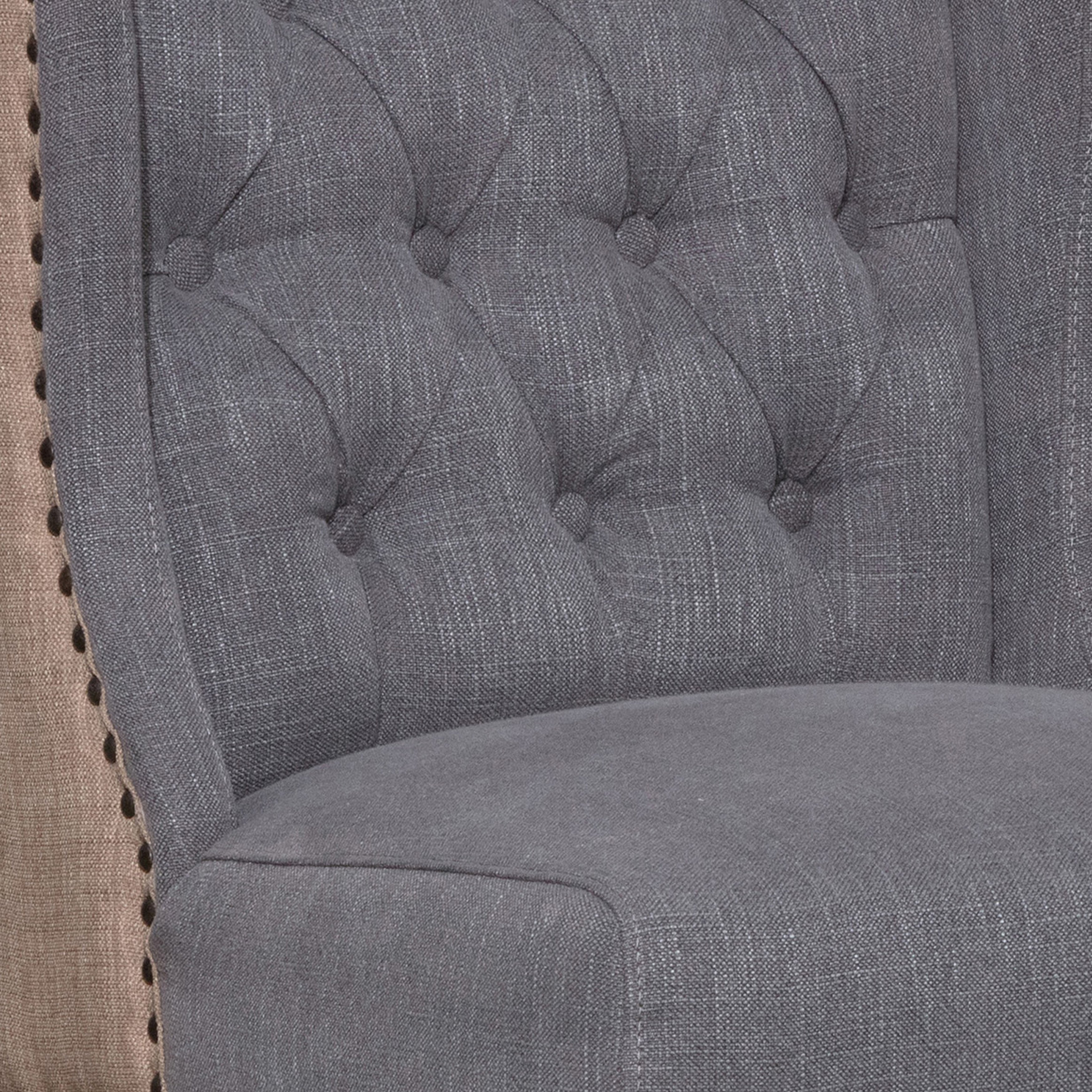 Classic charm and elegance adorn this luxurious, tufted Counter Stool. Wrapped with a grey linen blend upholstery and light brown jute on the back, this armless stool features a classic wingback silhouette and a foam filled seat for extra support. Diamond tufting and nail head trim complete the tailored look and traditional feel. Featuring four tapered rubberwood legs in an antique wood finish.