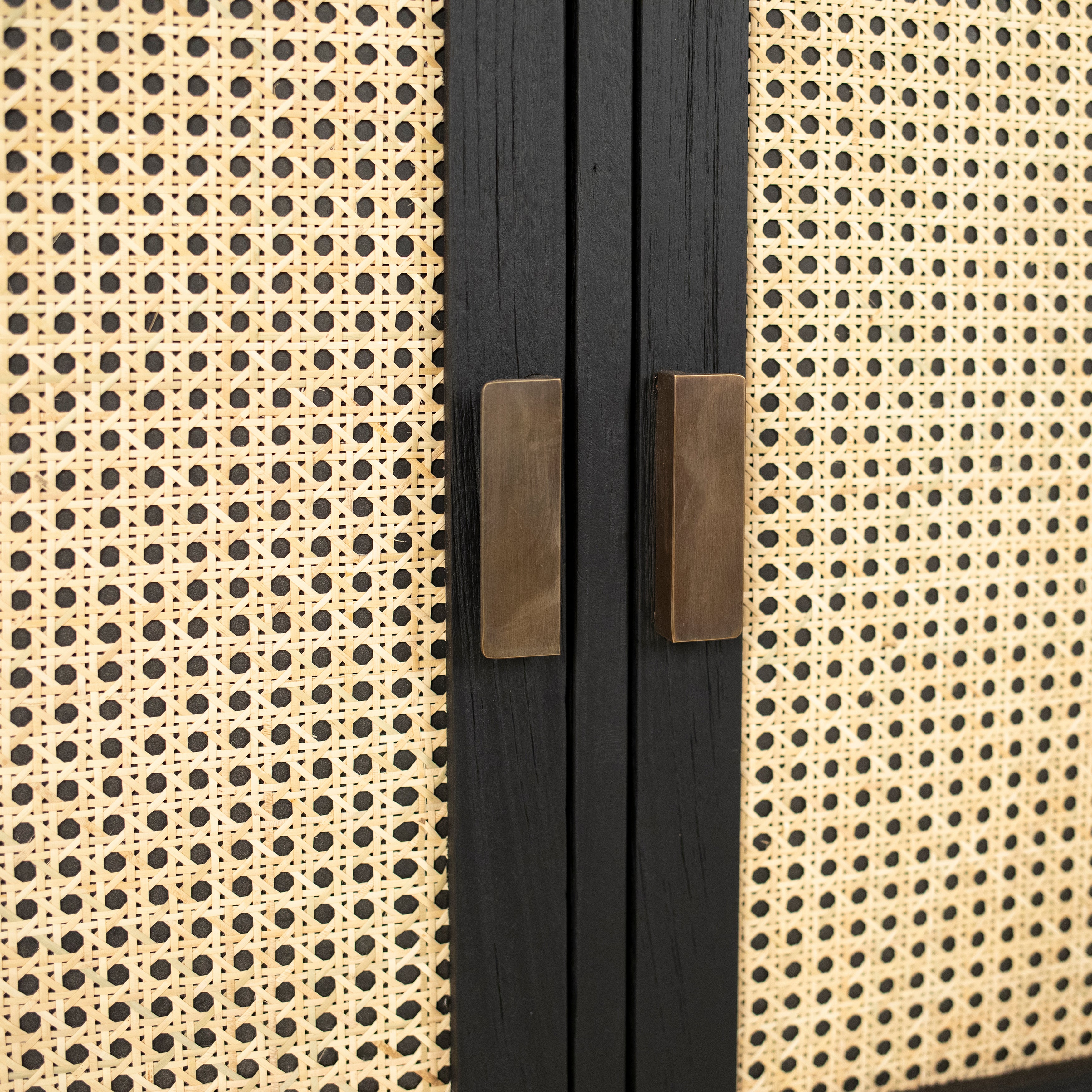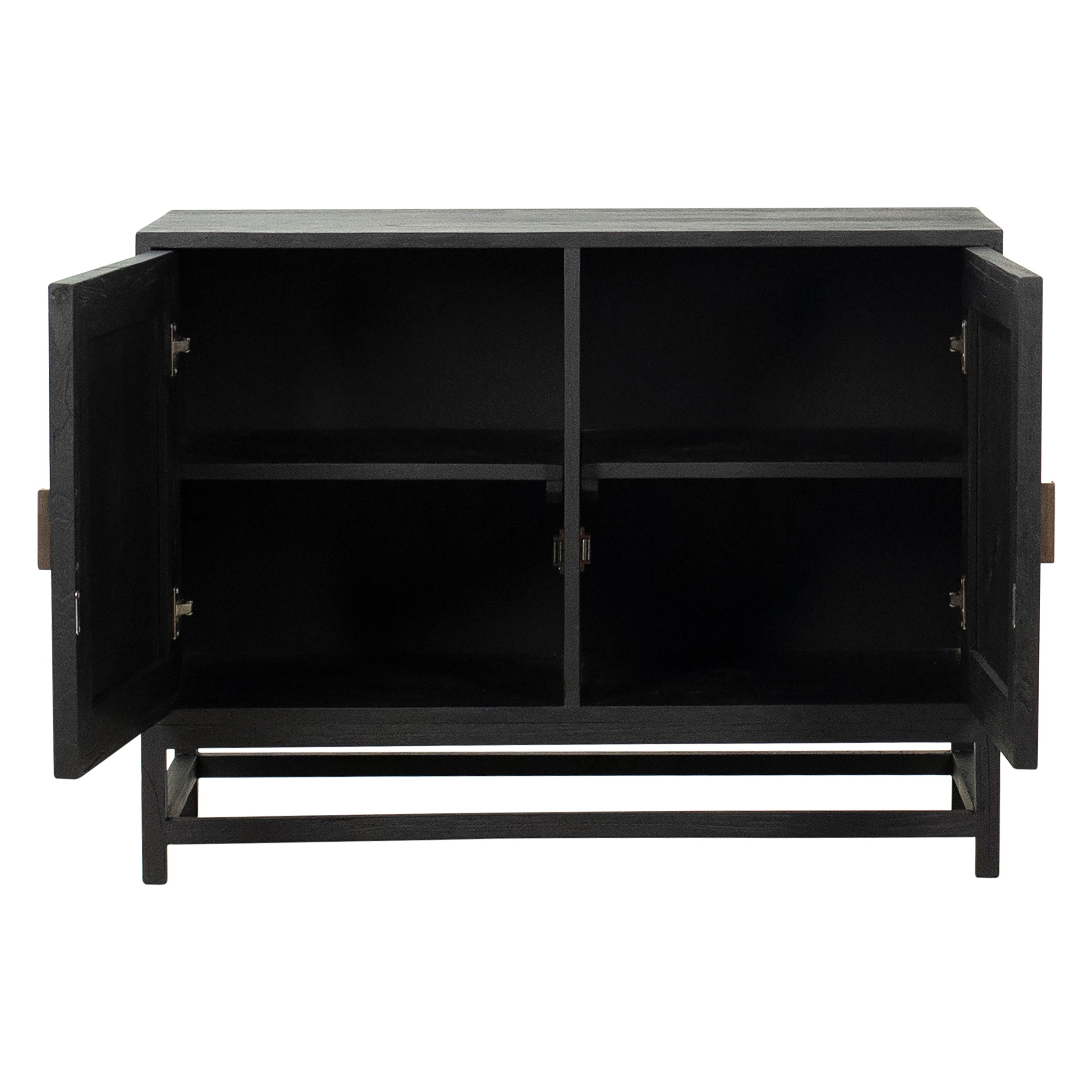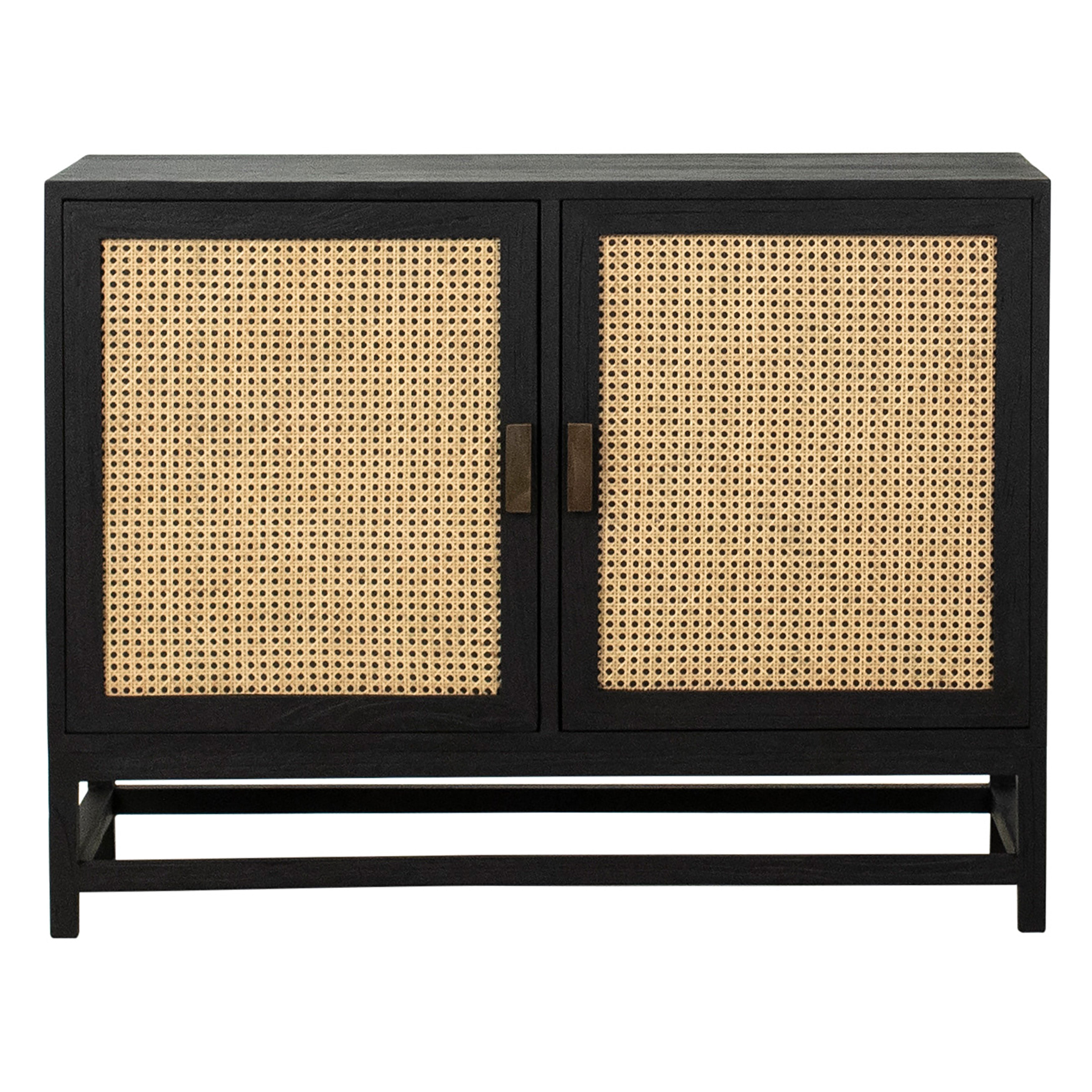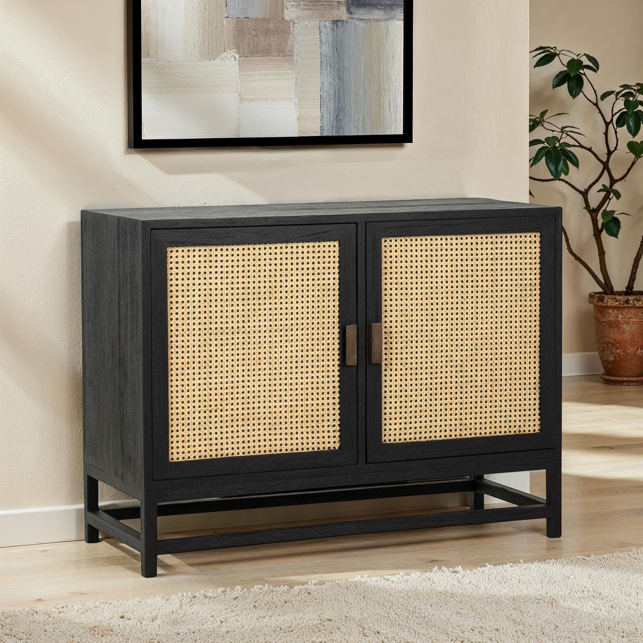 This 42” sideboard was perfectly designed to refresh your décor with modern coastal flair. Its rich black hardwood frame is beautifully offset by the natural woven rattan panel details of its double doors. Featuring ample storage and two interior fixed shelves that can accommodate dinnerware, electronics, or office supplies.