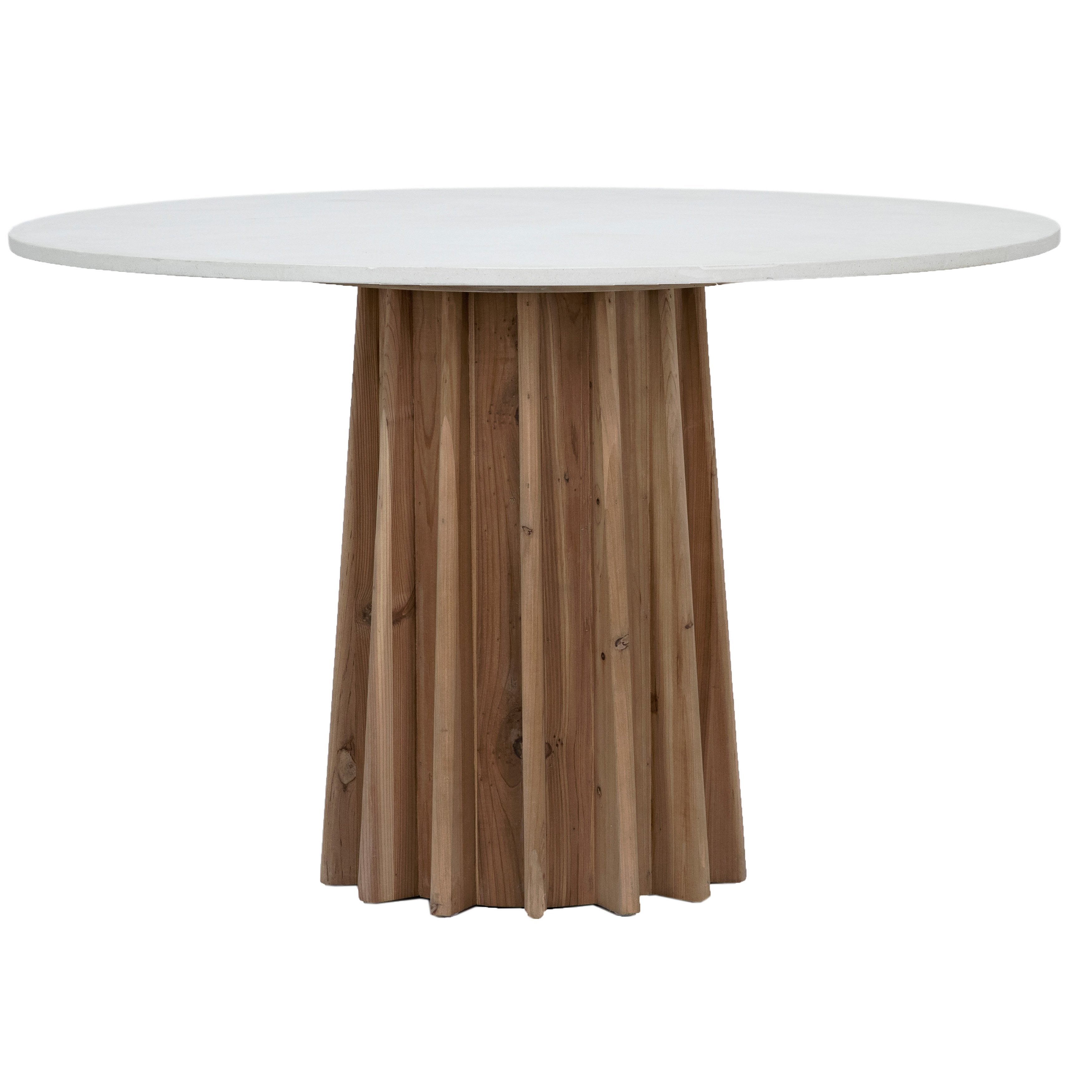 A fun approach to a classic dining table. Featuring a modern fluted base with a natural brushed pine wood finish and a smooth, white concrete 47” round tabletop. The mix of materials gives a beautiful contrast and sets the tone for your dining room or kitchen breakfast nook.